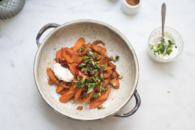 This is the most interesting carrot recipe I've attempted in a long time, and I'll start by attempting to explain why. In a single bite, you realize these carrots are drunk with a cooking liquid infused with fragrant spices like saffron, cumin, and cinnamon. They take on pops of sweetness because they are punctuated by dried fruit. Deep savory flavor balances out the sweetness and is developed through a lengthy simmer incorporating caramelized onions and tomatoes. You hit spots of fresh, green herbaceousness from mint, and chiles, and cilantro, and then crunch here and there from pistachios. I loved these carrots on their own. I loved them over fregola pasta (with yogurt). I loved them on sandwiches, and folded into toasted pita along with lots of arugula and shredded hard-boiled egg.