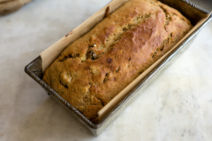 This is a straight-ahead banana bread, or as straight-forward as I get. I like my baked goods to have rustic wholesomeness to them, which is why you see a portion of whole wheat flour and brown sugar here. It makes your banana bread extra special and delicious (when compared to versions with white sugar and white flour). The recipe evolved to its current lazy-day state from this Melissa Clark gem. I skipped any add-ins for simplicity's sake here, and would recommend a banana-only first pass, but you can absolutely add ingredients like toasted nuts, chocolate chunks, citrus zests, herbs, toasted coconut, glazes, etc.